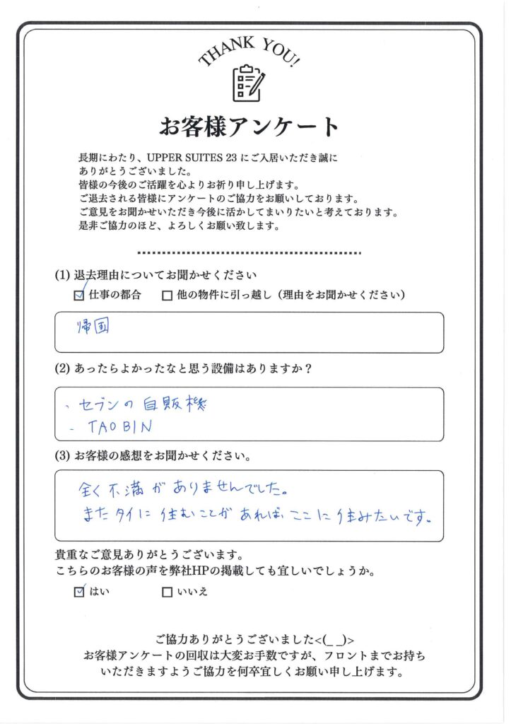アッパースイーツ・スクンビット23をご利用ありがとうございます。 あったらよかったと思う設備「とても充実していたため、特になし。」お住まいになってのご感想「メイドサービス含めとても行き届いており、改善してほしい点などもなかったです。すばらしいサービスをありがとうございました。」!ご滞在中は何かとご迷惑をお掛けしたかもませんが、3年の長きに渡りご利用頂き、またこのような温かいお言葉を頂戴し誠にありがとうございます! どうか体調にはお気をつけ頂き、お元気でお過ごしされるようお祈りしております♪